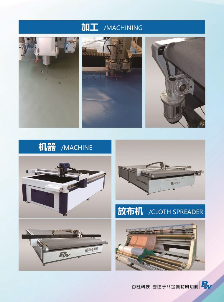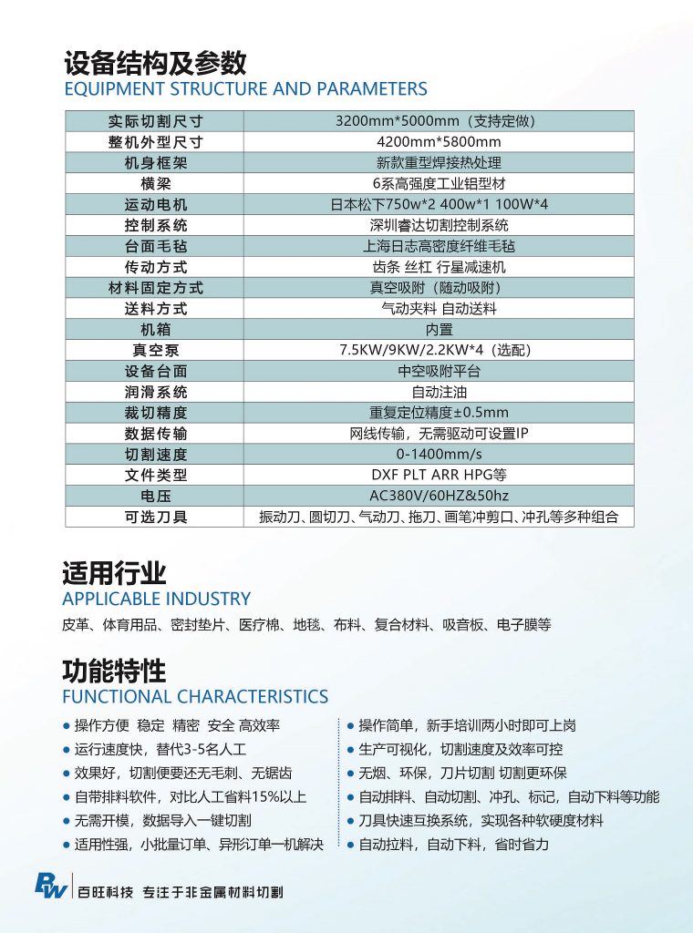 针对柔性材料切割,百旺科技有用丰富的定制经验,如多机头、双横梁、加长加宽裁切面积等,还可根据材料或工艺要求的不同,为用户提供一对一专属裁切方案,设备可选配大视觉系统、投影仪、自动送料装置等,以满足不同的个性化生产需求。